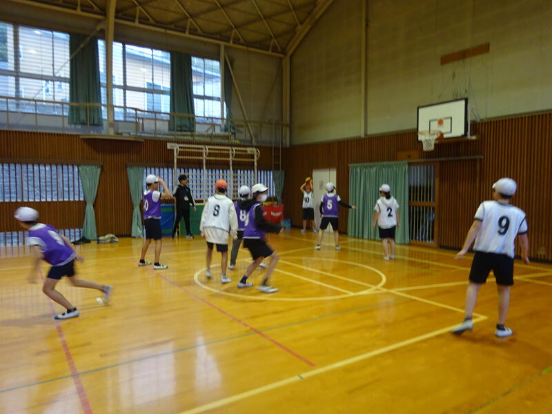 また、5時間目5.6年生の合同体育でした。5.6年合同でテームを作り、作戦を立てながら試合をしています。それぞれのチームが協力してバスケットボールの試合をしていました。