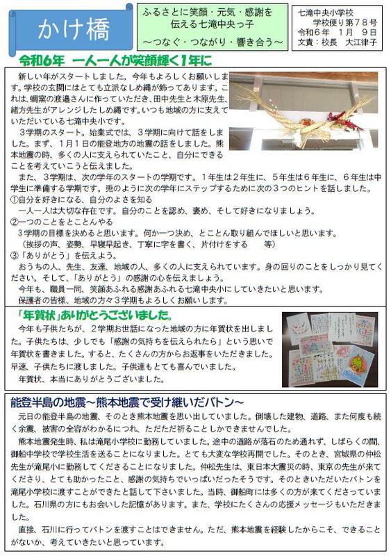 令和5年も大変お世話になりました。新しい年も子供たちの笑顔にあふれる七滝中央小にしていけるように職員一同、がんばっていきたいと思っています。