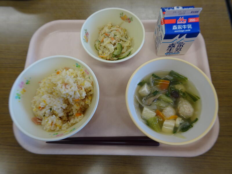 今日のメニュー:五目チャーハン、肉団子のスープ、バンバンジーサラダ、牛乳