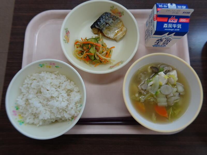 今日のメニュー:有機米ご飯、根菜のごま汁、鯖の塩焼き、キクラゲの酢の物、牛乳