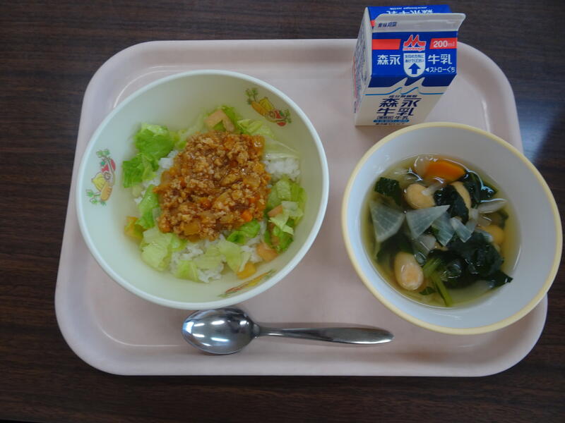今日のメニュー :タコライス(麦ご飯、タコライスの肉、野菜)、野菜スープ、牛乳