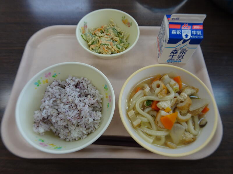 今日のメニュー :わかめごはん、豚肉となすのうどん、ほうれん草サラダ、牛乳