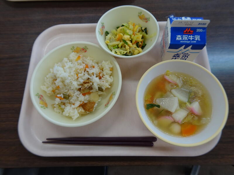 本日のお品書き:じゃこ菜めし・肉うどん・ごぼうサラダ・牛乳
