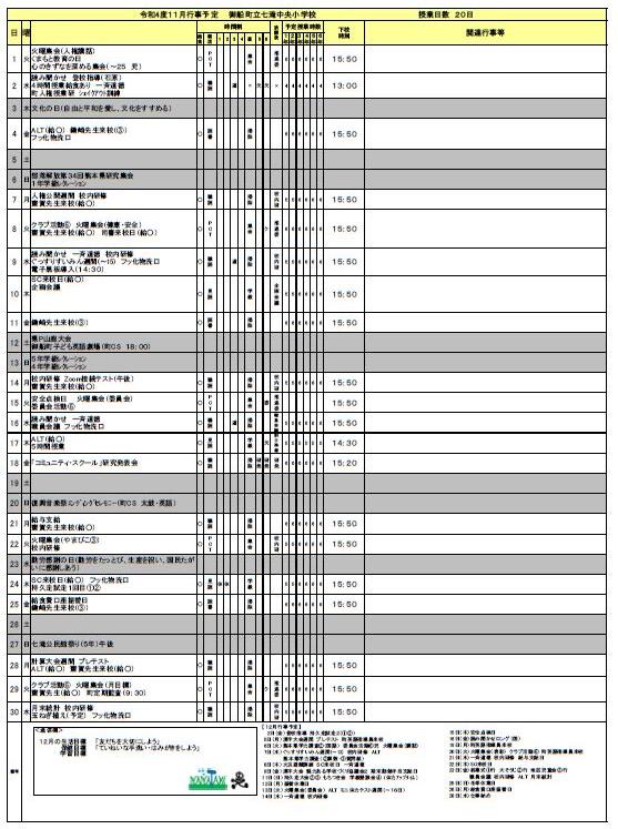 少しずつ過ごしやすい季節となってきました。子供たちはこれまで以上に、学習に運動にと頑張ってくれることと思います。11月の行事予定表をアップしますので、ご確認下さい。11月は「学習発表会」があります。今年度は、午後開催ですので、お気を付け下さい。