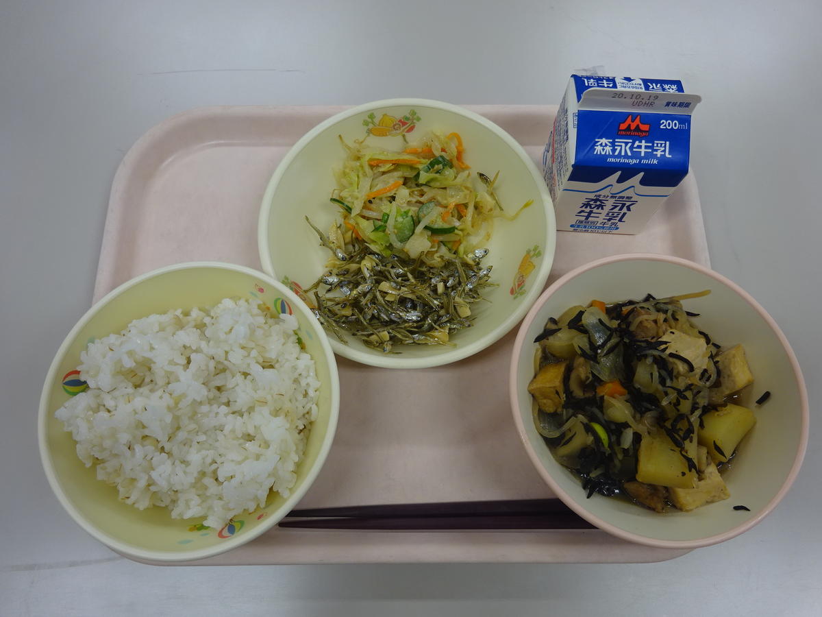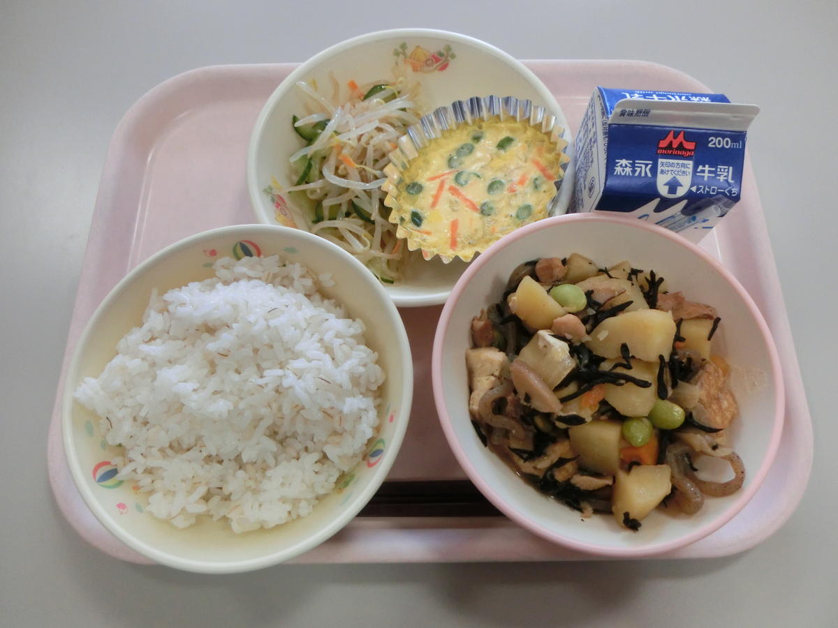 | わかめごはん じゃがいものそぼろに ちりめんサラダ ざぜんまめ 牛乳 |