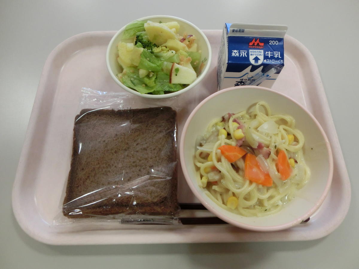 | ココアパン スープスパゲティ さつまいものサラダ 牛乳 |