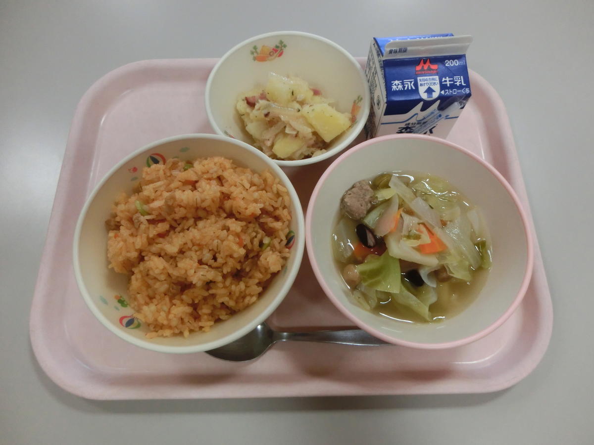 | やきにくピラフ はるキャベツのスープ ポテトサラダ 牛乳 |