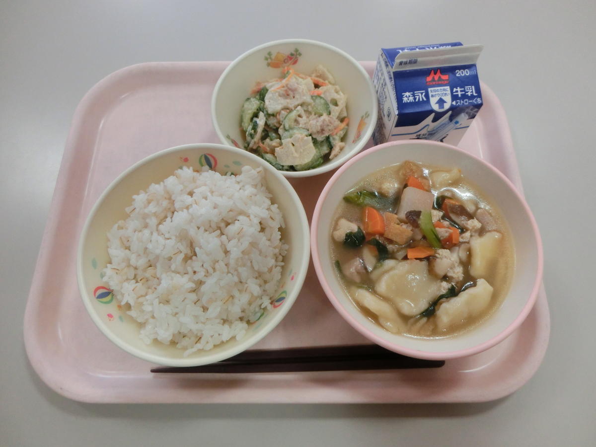 | むぎごはん だごじる れんこんサラダ 牛乳 |