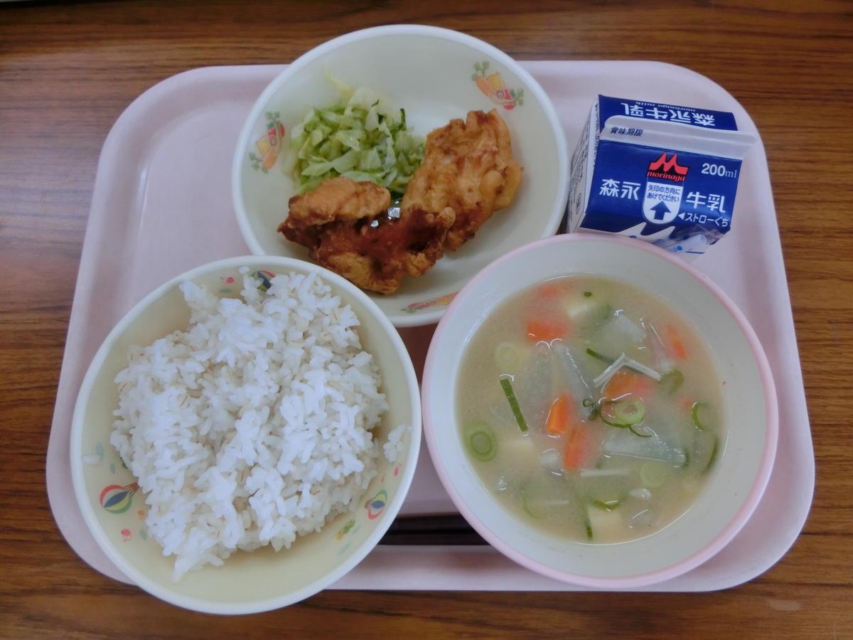 | むぎごはん みそけんちんじる あまくさだいおうのからあげ レモンあえ 牛乳 |
