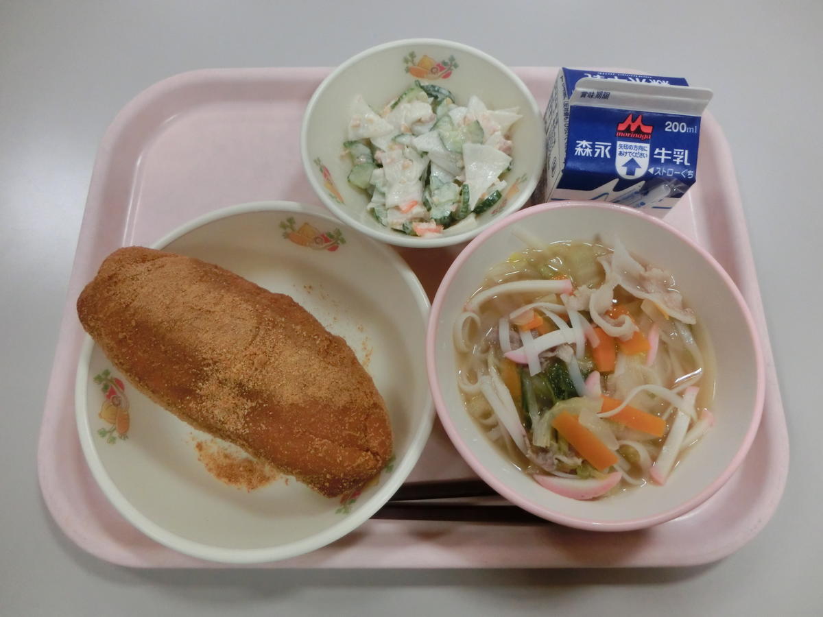 | きなこあげパン たまごスープ かいそうサラダ フルーツヨーグルト 牛乳 |