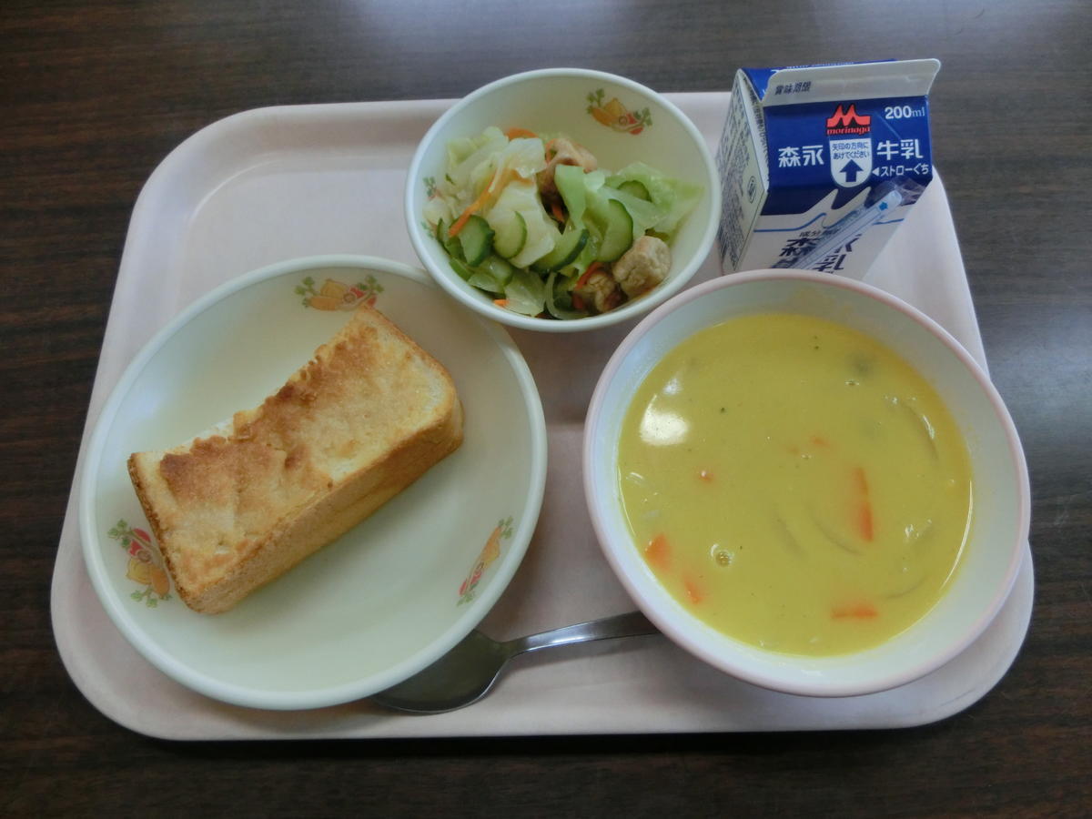 | アーモンドトースト かぼちゃのクリームスープ あまずサラダ 牛乳 |
