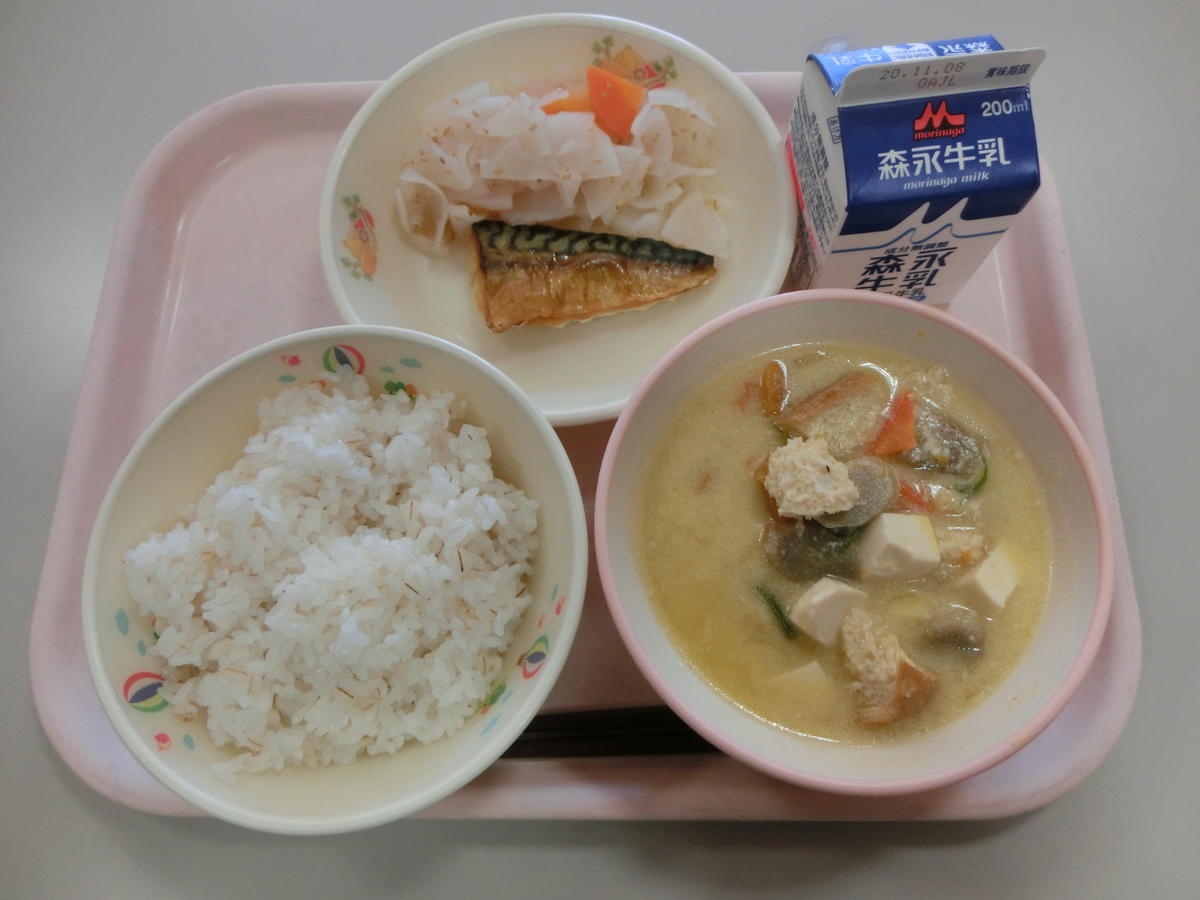 | むぎごはん のっぺいじる しおさば さっぱりあえ 牛乳 |