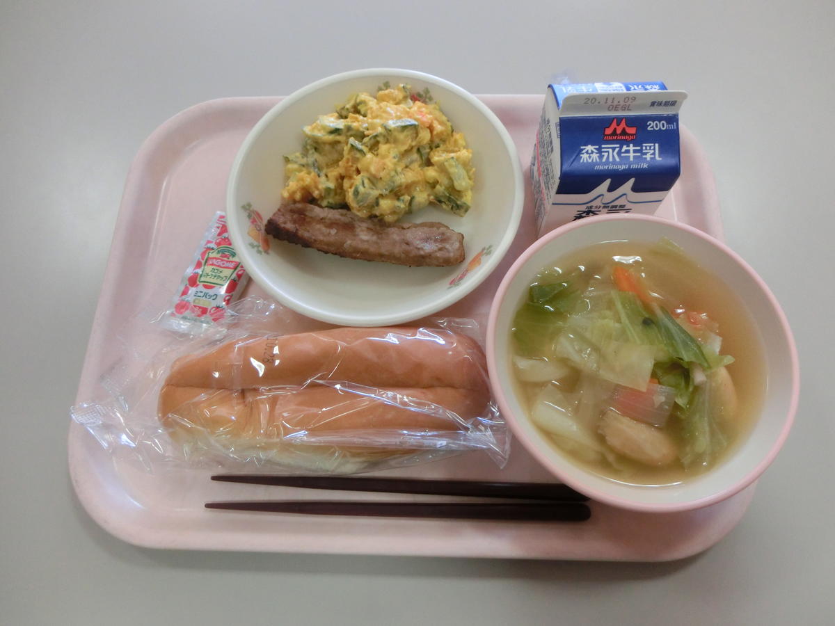| エッグサンド こまつなのクリームスープ だいずのチョコりんかけ 牛乳 |