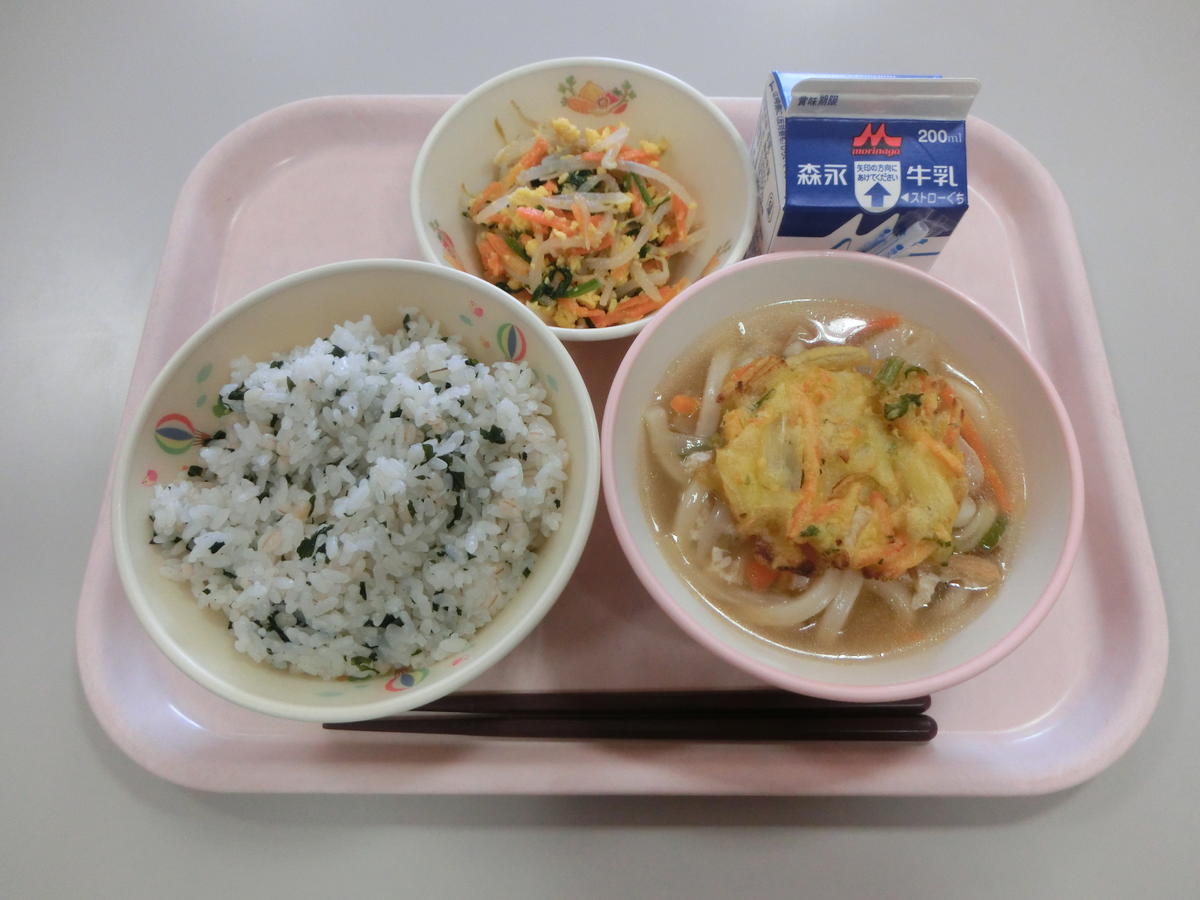 | わかめごはん かきあげうどん ごしきあえ 牛乳 |