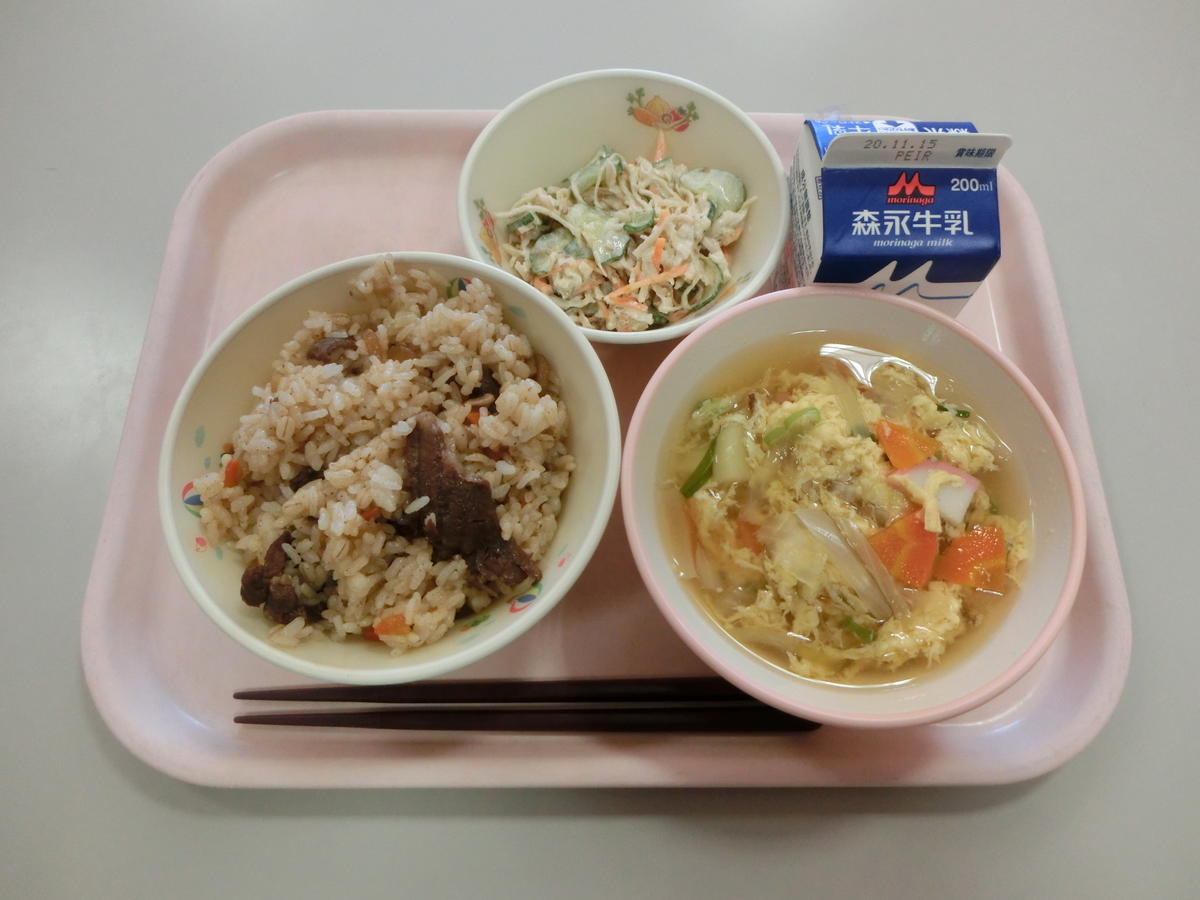 | こぎつねごはん かきたまじる はるさめのマヨネーズあえ 牛乳 |