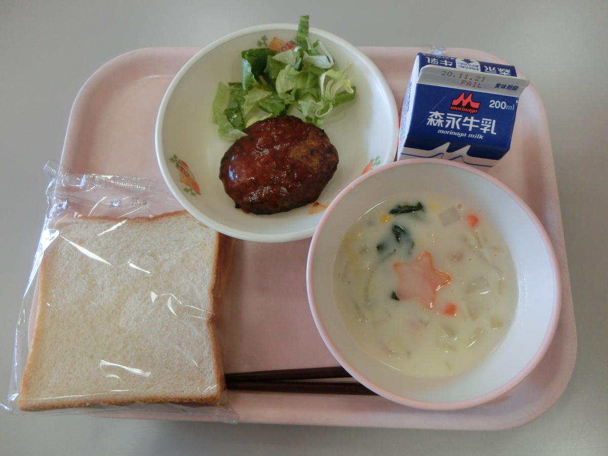 | 食パン はくさいのクリームスープ てづくりハンバーグ レタス 牛乳 |