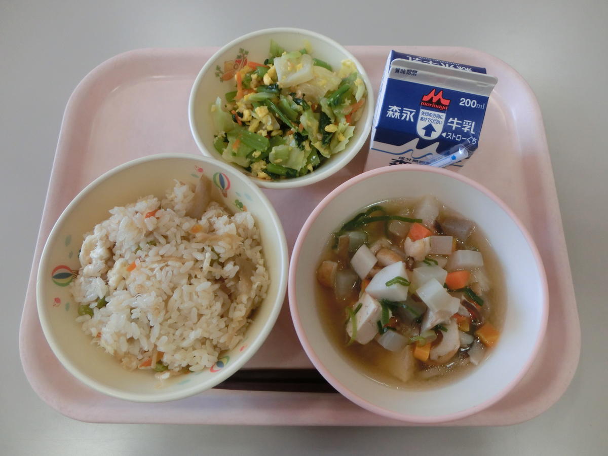 | だいこんめし さといものそぼろに はくさいのひじきあえ ほうれんそうのだしまきたまご 牛乳 |