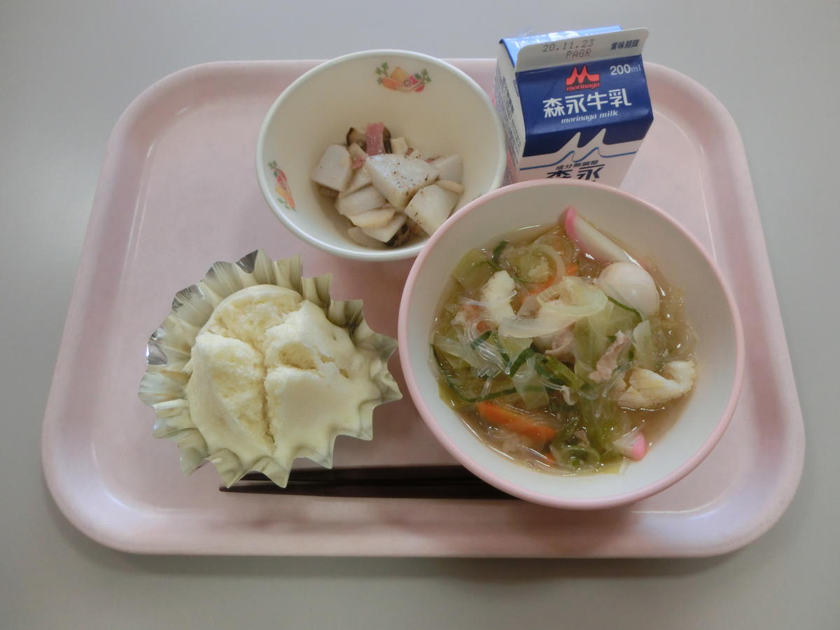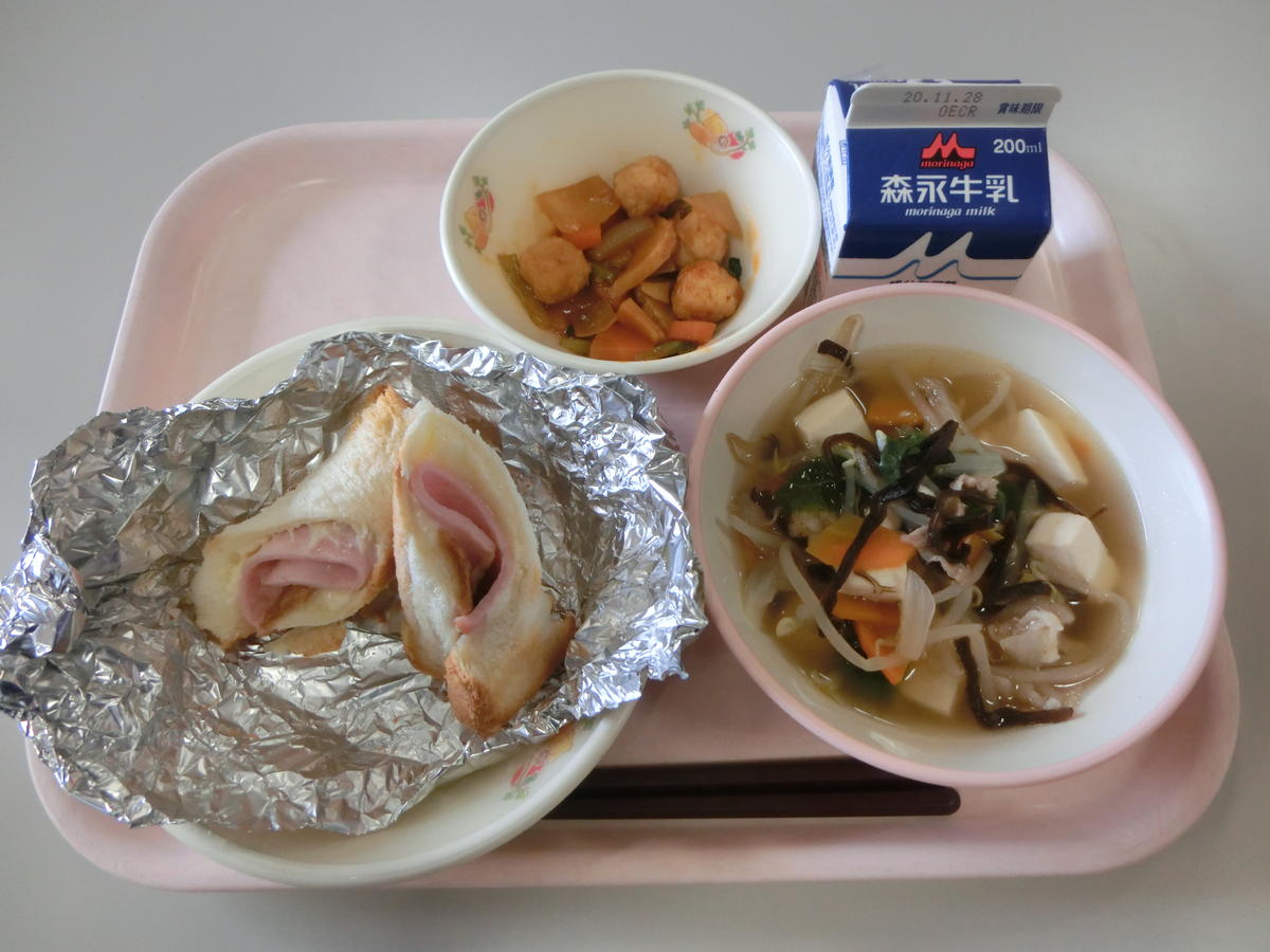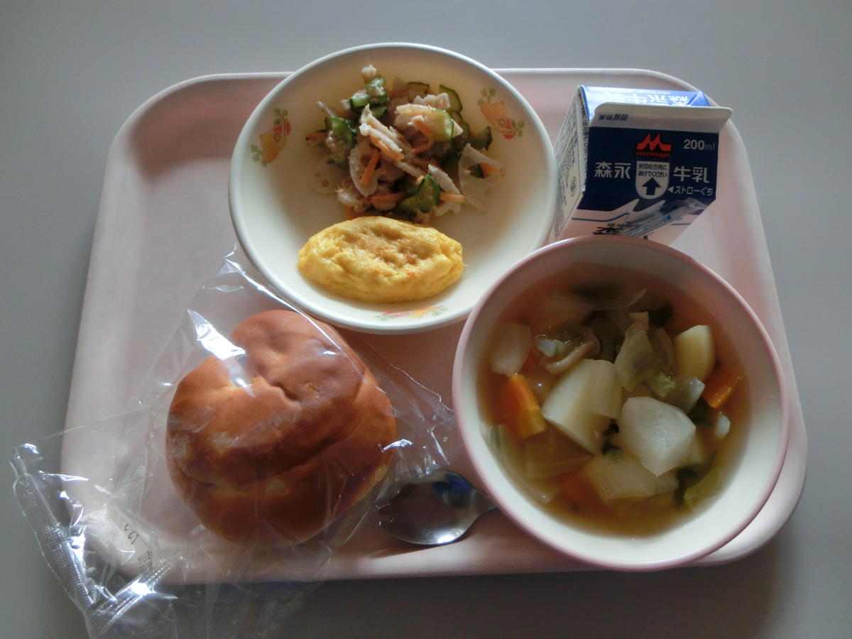 | パインパン ふゆやさいのポトフ れんこんツナサラダ トマトオムレツ 牛乳 |