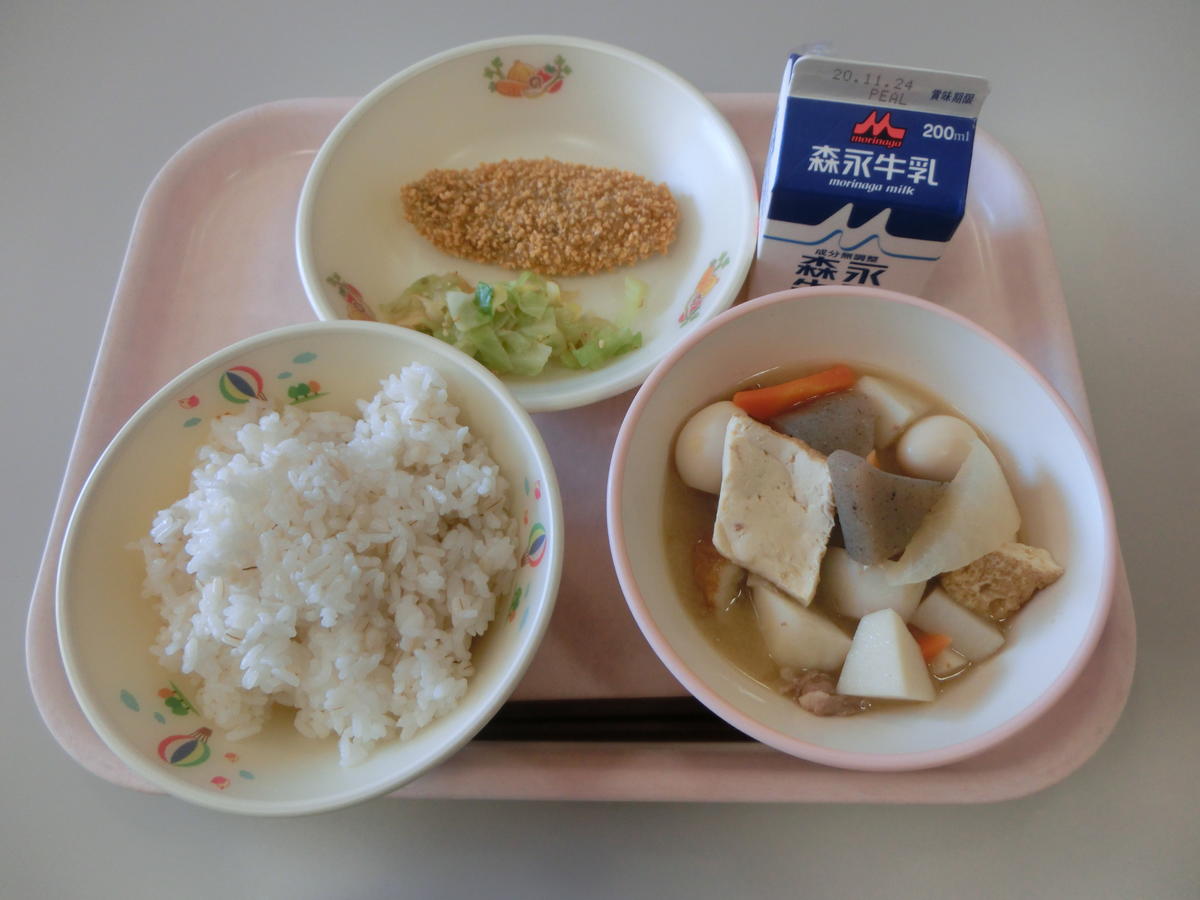 | むぎごはん みそけんちんじる かぼちゃひきにくフライ ゆずふうみサラダ 牛乳 |