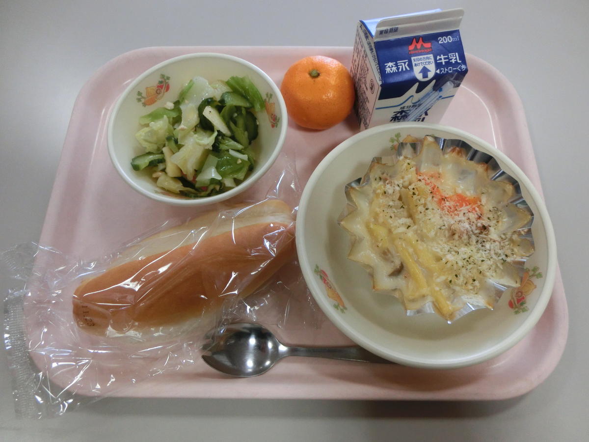 | ソフトフランスパン グラタンふう フレンチサラダ みかん 牛乳 |