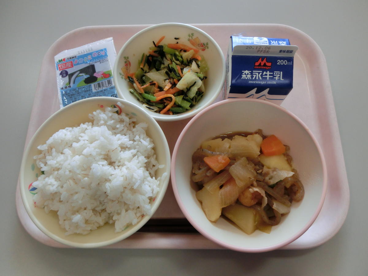 | むぎごはん ちゃんこなべ さかなのなんばんづけ 牛乳 |