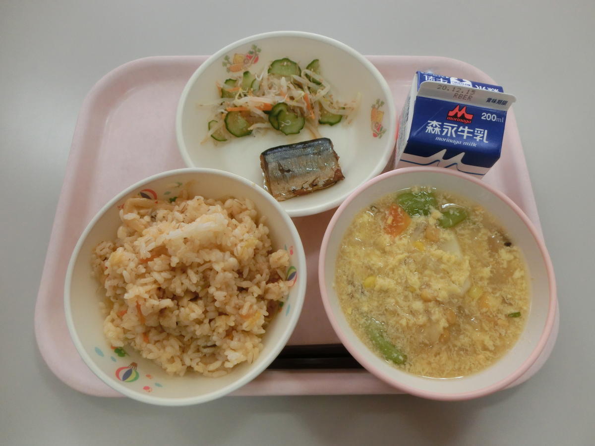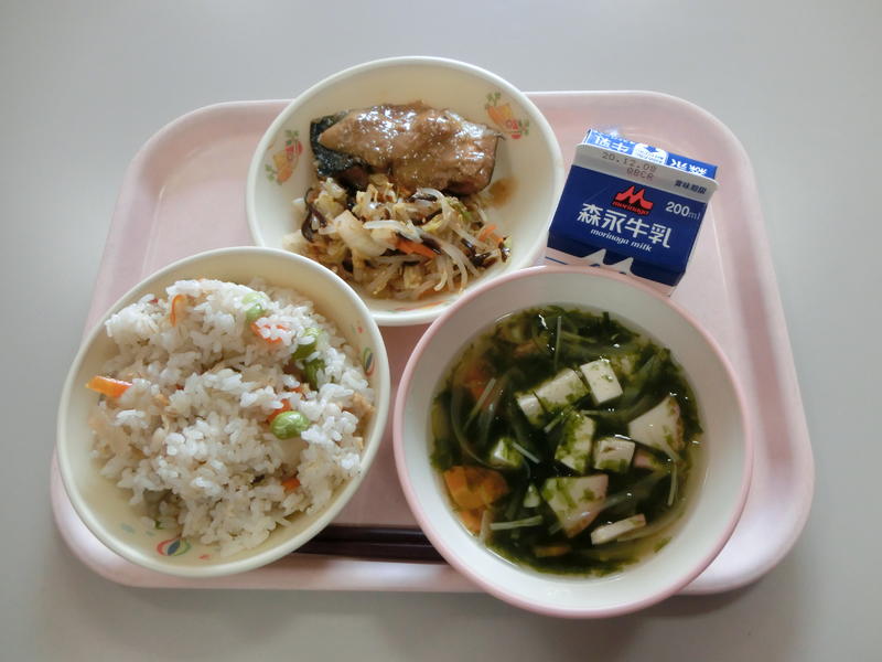 | ごぼうピラフ まめとトマトのスープ さかなのカレーマリネ 牛乳 |
