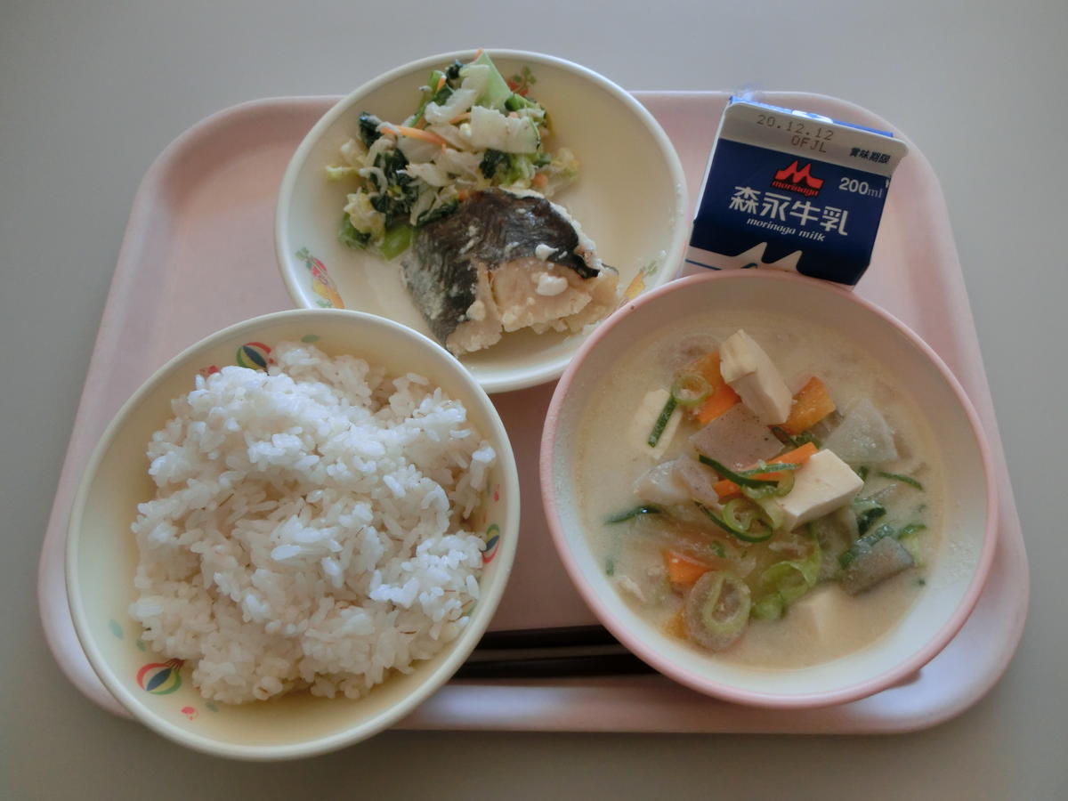 | むぎごはん とうにゅうとんじる さかなのしおこうじやき こまつなのゴマネーズあえ 牛乳 |