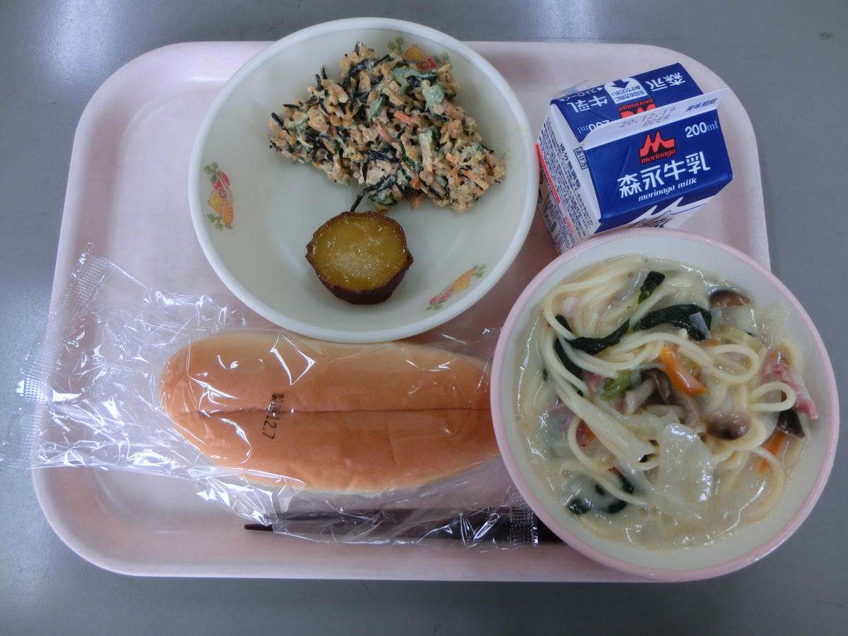 | ミートスパゲティ かいそうサラダ さつまいもむしパン 牛乳 |