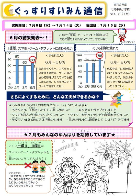 明日から「ぐっすりすいみん週間」です。久しぶり実施した6月は予想以上に良い結果でした。7月もしっかり目標をもって、テレビ・スマホ・ゲームの使用をコントロールできるようにがんばりましょう!