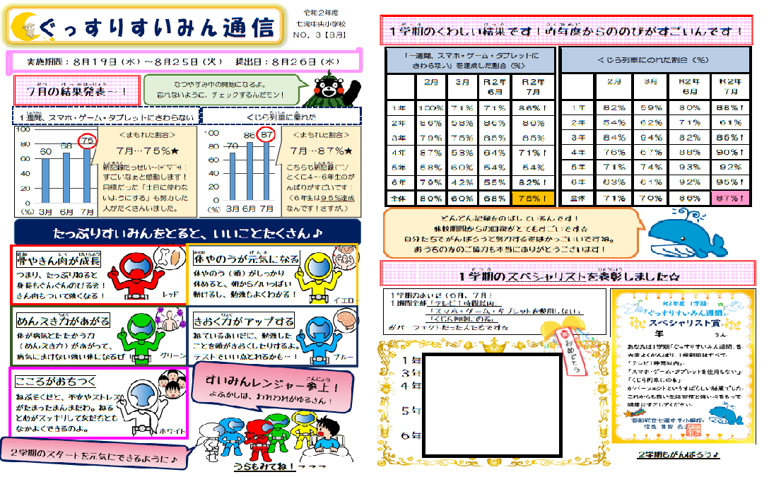 本校がPTA・地域と一体となって取り組んでいる「ぐっすりすいみん週間」は、この7月で3年目へ突入します。本取組の経緯や意義は、本ホームページ「本校の教育・PTA活動」をご覧ください。ちなみに、これまでの結果はご覧のとおりです(^^)/