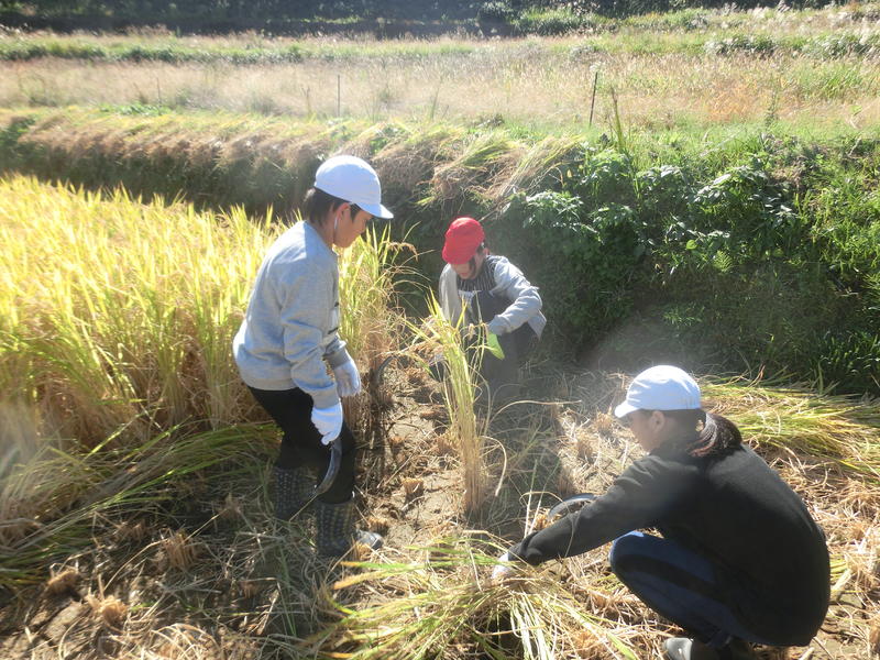 5年生は総合的な学習の時間で「稲刈り体験」をしました。6月に5年生が植えた「もち米」が大きく生長しました。川口勝之さんと吉田髙之さんに刈り方のご指導をしていただきました。また藤本早苗さんにも作業のお手伝いをしていただきました。ほとんどの子どもが初めての体験でしたが、稲刈りの「ザクッ、ザクッ」という音が気持ちよく、どんどん作業を進めていました。120kgのもち米が収穫できました(^^)/
