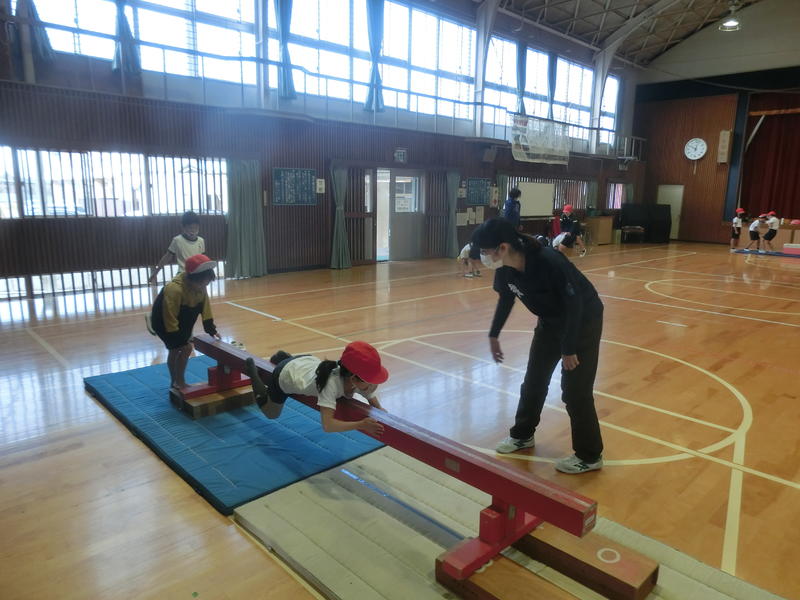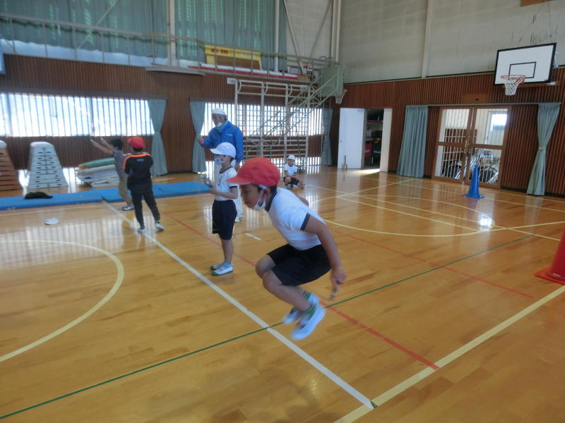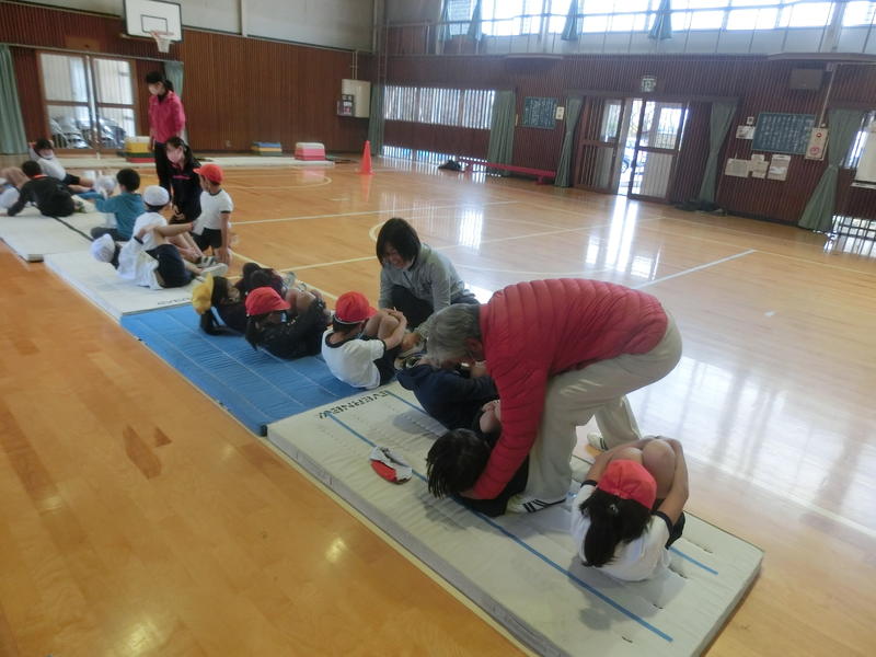 1・2年生は体育で「にんじん修行・・・」でなく「にんじゃ修行」をしていました。みんなでまず回転感覚をつかんでいました。その後それぞれの場で、場に応じた動きを発揮していました(^^)/