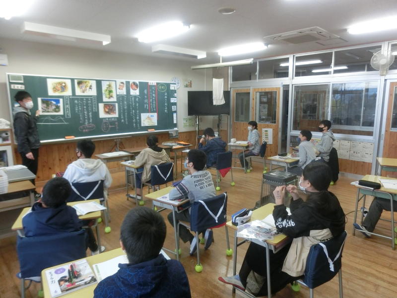 6年生は国語「『鳥獣戯画』を読む」の学習をしていました。まず、洋画を含む4枚の絵のよさを話し合い、そのうえで「鳥獣戯画は人類の宝である」という文に着目させて、学習の目標づくりをしていました。これから、「鳥獣戯画」の素晴らしさをしっかり読み取ってくださいね(^^)/