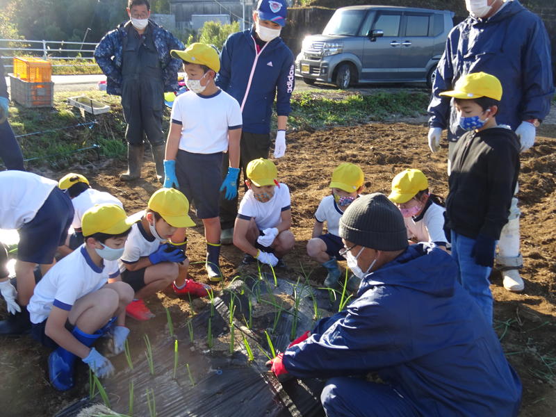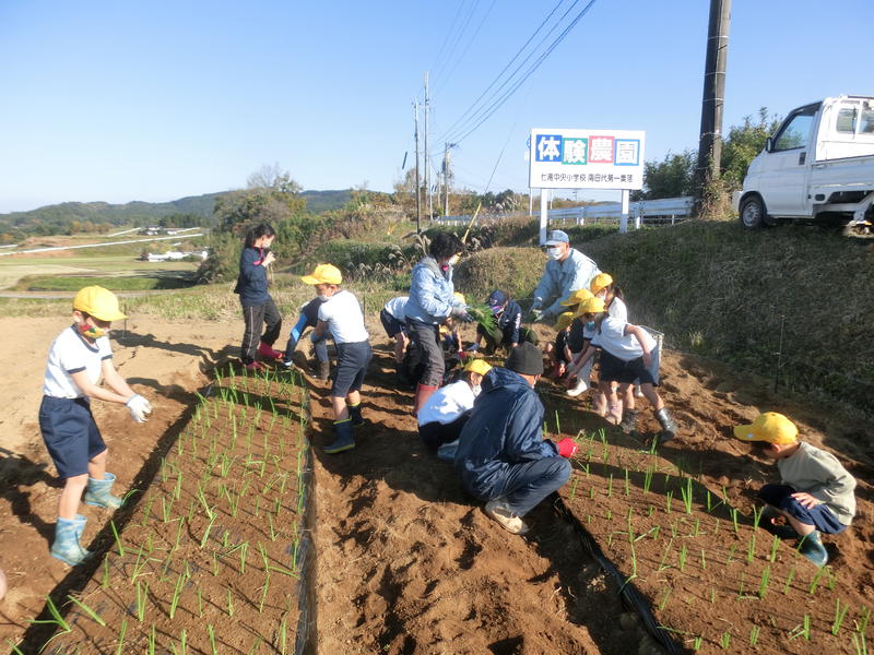 1・2年生が学校体験農園で「玉ねぎ植え」を行いました。地域の方々に植え方のご指導に来ていただき、2200本もの玉ねぎの苗を植えることができました。子供たちは大変手際よく植え、あっという間に黒いマルチの上に、緑の苗が並びました。1年生のある子は、「チェック係」を特にがんばり、1本1本「OK!OK!OK!・・・(2200回)」と指さしながらジャッジをしていました。来年6月に玉ねぎを収穫します。収穫が楽しみですね(^^)/
