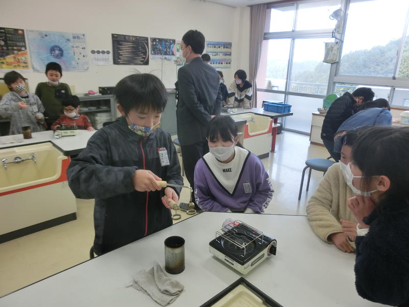 4年生は理科「ものの温度と体積」の学習をしていました。鉄球を温めて、輪っかに入るか実験をしました。実験中に「うぉー!」と歓声が・・・。結果はどうだったんでしょうか(^^)/