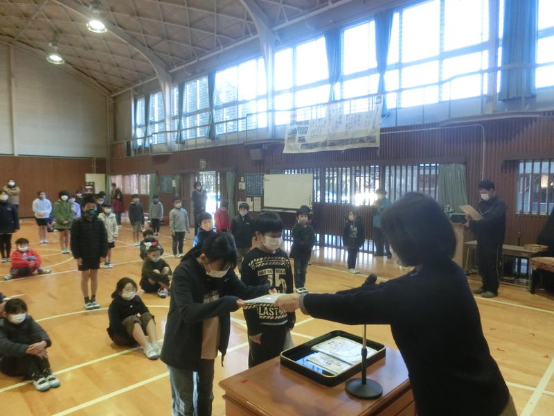 「ぐるぐるランニングで頑張ったで賞」では、体力向上のぐるぐるランニングの取組で運動場を457周も走った1年生が代表で表彰を受け、副賞に「図書室の本をプラス一冊借りられる券」をもらいました(^^)/