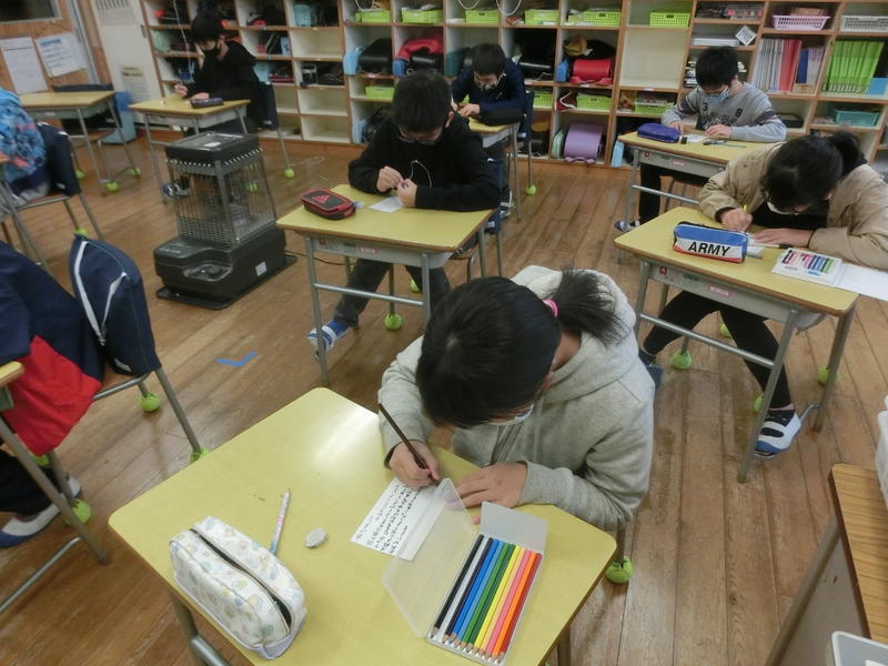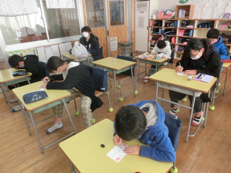 5年生は、今年、本校がお世話になった地域の方々に年賀状を書いていました。この取組は本校が地域との絆を深めるために毎年行っている取組です。6年生も気持ちを込めて、地域の方にお礼の年賀状を書いていました(^^)/