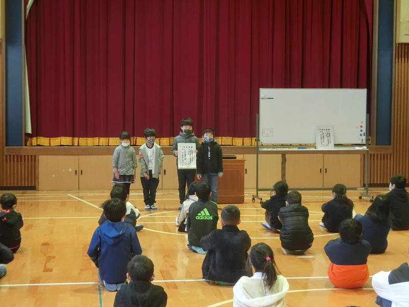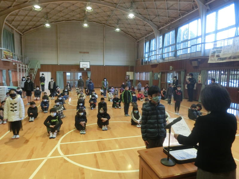 金曜集会では、1・2年生が代表して12月の月目標の振り返りを行いました。「換気隊長の呼びかけで、換気がしっかりできました。」と発表していました。