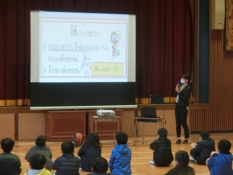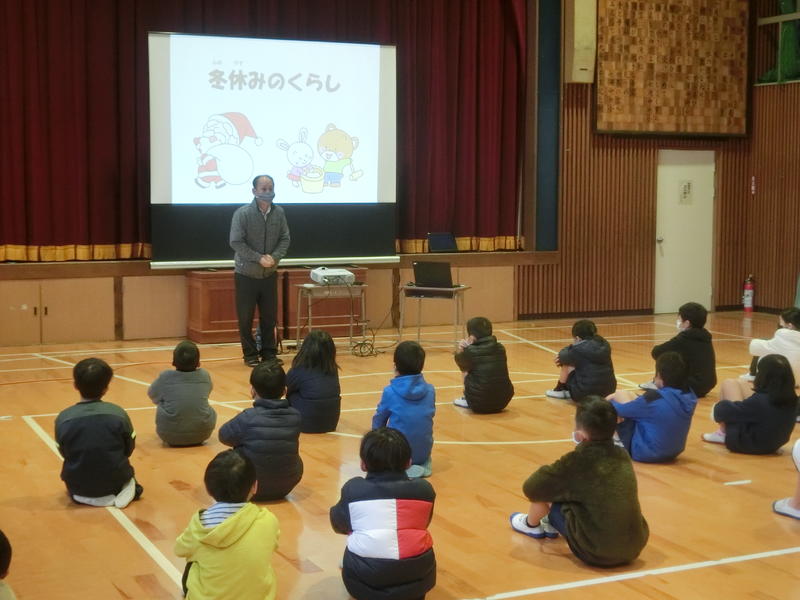 火曜集会では、冬休みのくらしについて安全面と健康面のお話がありました。交通安全のルールや規則正しい生活などスライドを使って分かりやすい説明がありました。安全で健康な、冬休みを過ごせるようにしましょう!