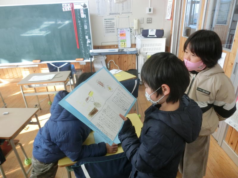 4年生は国語「日本文化を発信しよう」の学習をしていました。伝統芸能に関するリーフレットを作って発表会を行っていました。こけしやだるまなど、図やイラストを効果的に使って分かりやすいリーフレットができあがっていました(^^)/