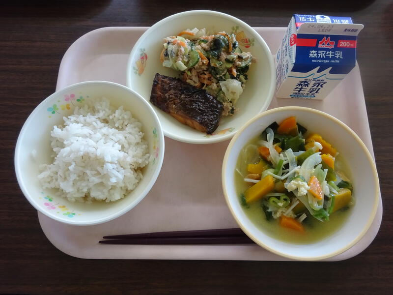 給食のメニュー:麦ご飯、かぼちゃの味噌汁、ぶりの照り焼き、ツナサラダ、牛乳