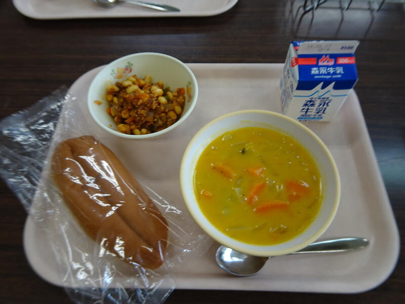 今日のメニュー:コッペパン、パンプキンポタージュ、チリコンカン、牛乳
