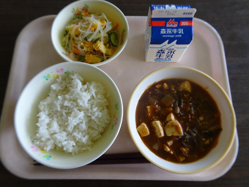 今日のメニュー:麦ご飯、マーボー豆腐、春雨のあえもの、牛乳