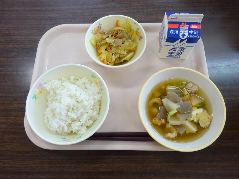 本日のメニュー:麦ご飯、具だくさん汁、豚肉の生姜焼き、牛乳