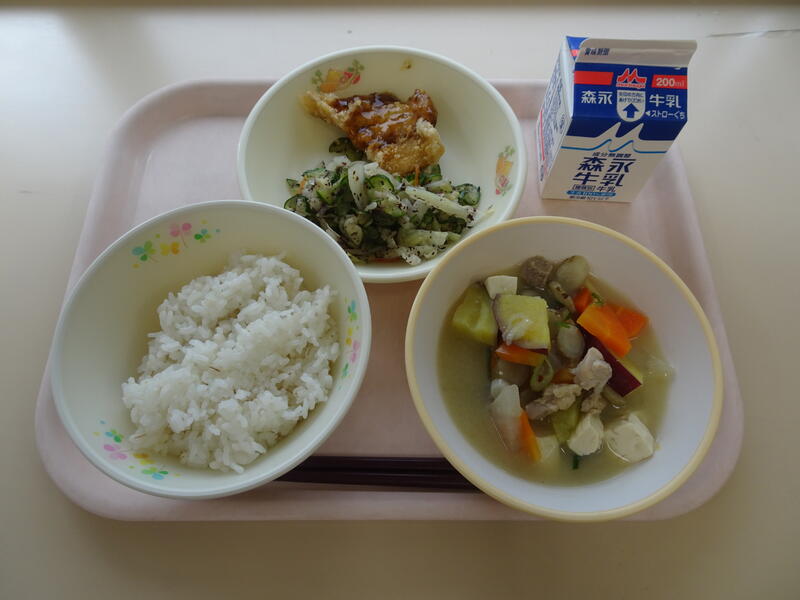 今日のメニュー:麦ご飯、さつま汁、ホキの和風ソース、ゆかりあえ、牛乳