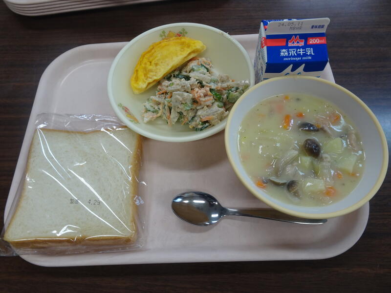 今日のメニュー:食パン、じゃがいものポタージュ、ミートオムレツ、れんこんのサラダ、牛乳