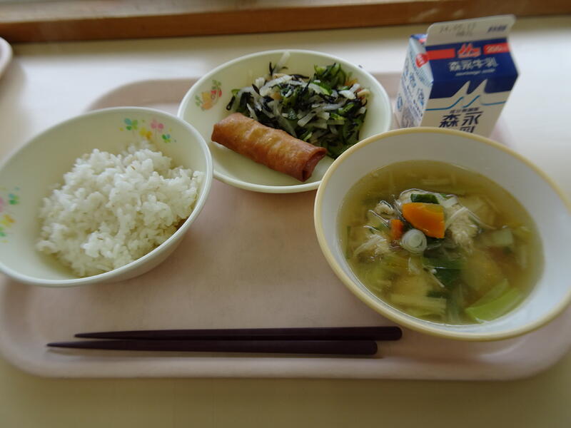 今日のメニュー:麦ご飯、手作り肉団子スープ、春巻き、ひじきの中華和え、牛乳