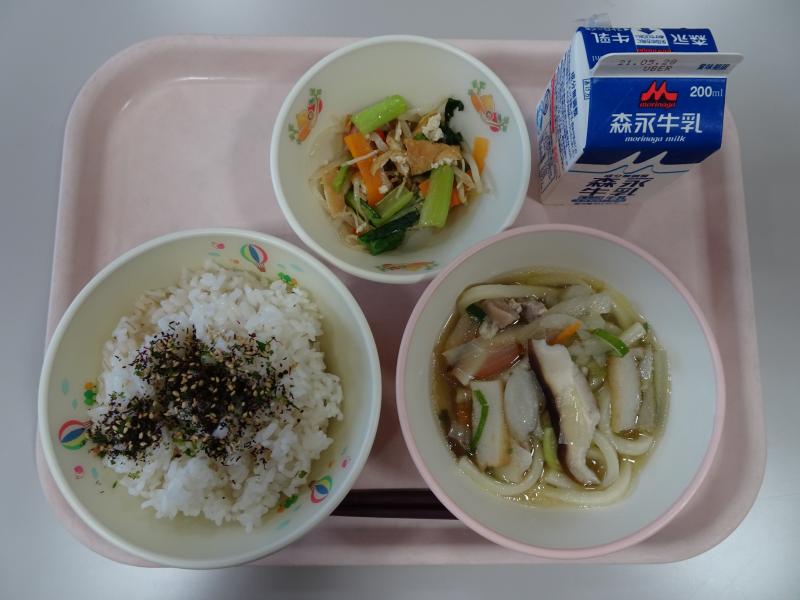 麦ごはん、手作りふりかけ、牛乳、五目うどん、なやき