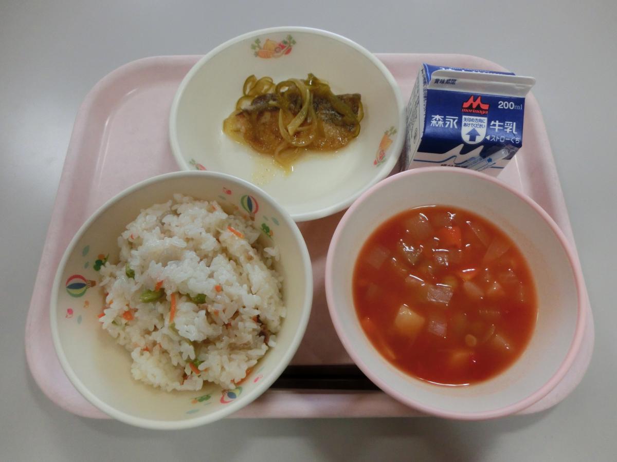 | ごぼうピラフ まめとトマトのスープ さかなのカレーマリネ 牛乳 |