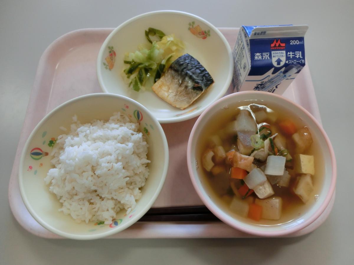 | むぎごはん のっぺいじる しおさば さっぱりあえ 牛乳 |